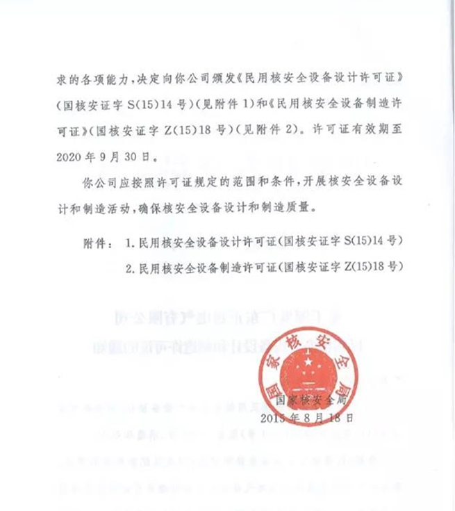¹ú¼ÒºËÇå¾²¾ÖÕýʽ½ÒÏþÎÒ˾¡¶ÃñÓúËÇå¾²×°±¸Éè¼ÆÔÊÐíÖ¤¡·ºÍ¡¶ÃñÓúËÇå¾²×°±¸ÖÆÔìÔÊÐíÖ¤¡·